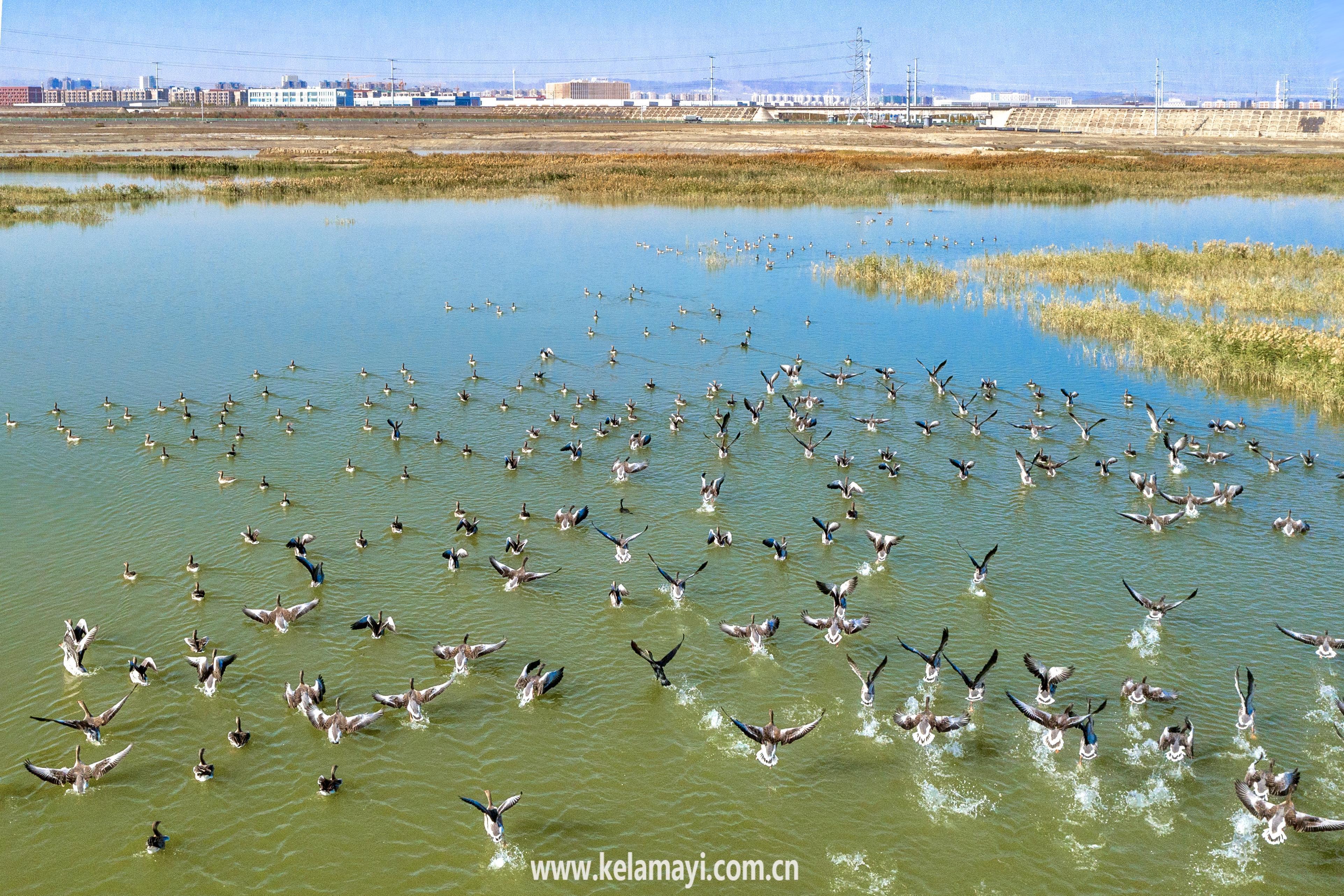目前,该生态公园内零星分布的大小水域都被芦苇、红柳、梭梭以及新种植的灌木林包围,环境静谧、水质清澈,吸引了鸬鹚、银鸥、白鹭、绿头鸭等大量野生鸟类栖息繁衍,在调节我市小气候、涵养水源、保护生物多样性等方面发挥了重要作用。