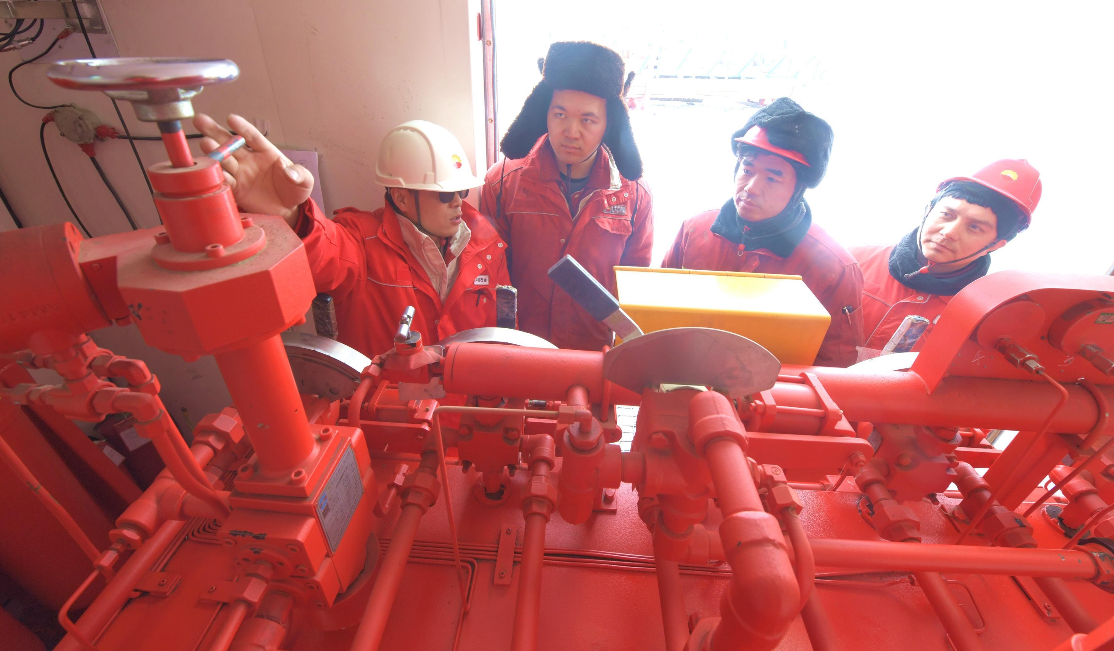 2月17日,西部钻探准东钻井公司50580钻井队技术员王军德正在玛湖134井远控房对员工进行实操与保养培训。