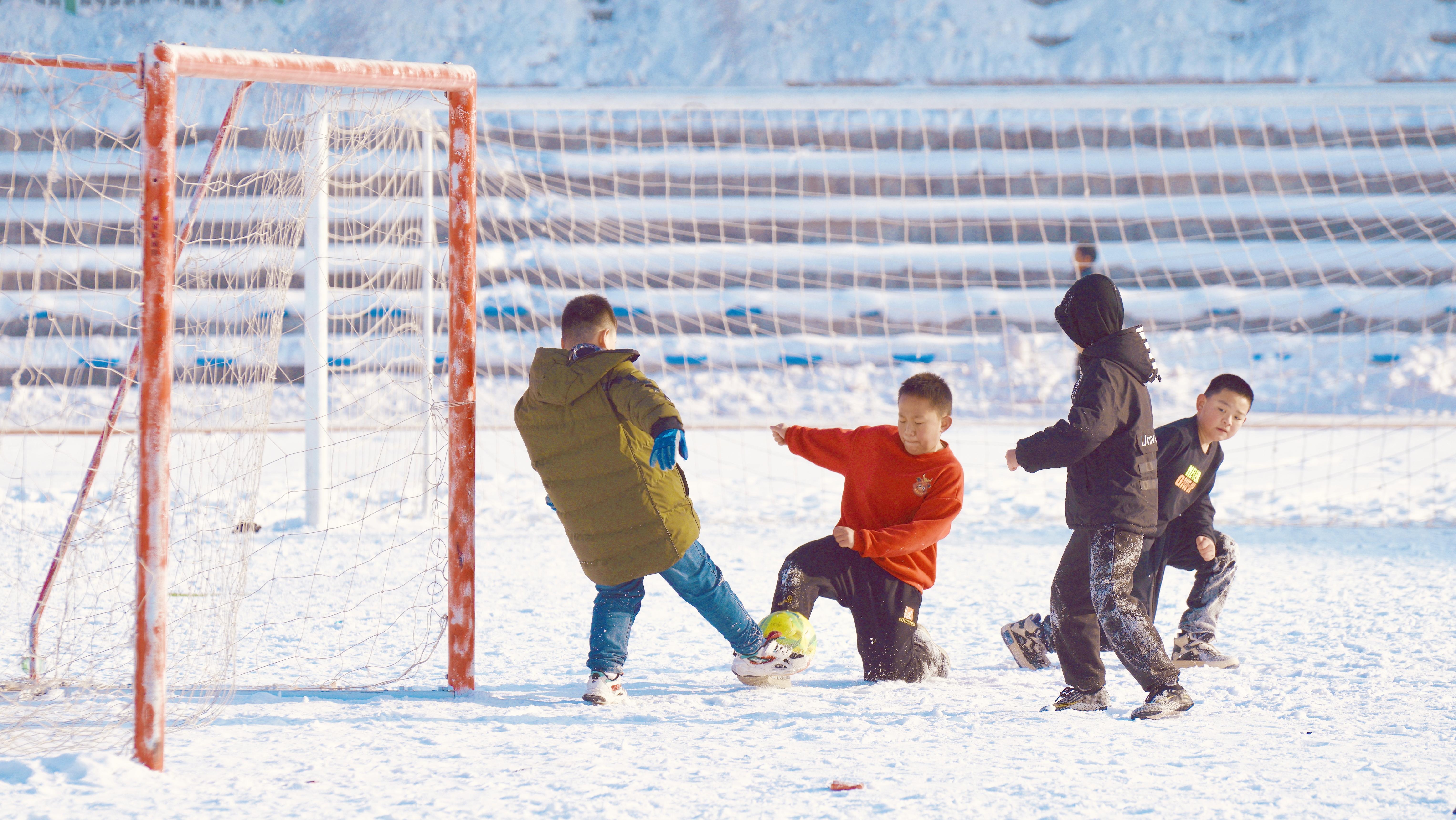 2月19日,独山子区体育中心,一群小学生正在踢雪地足球。