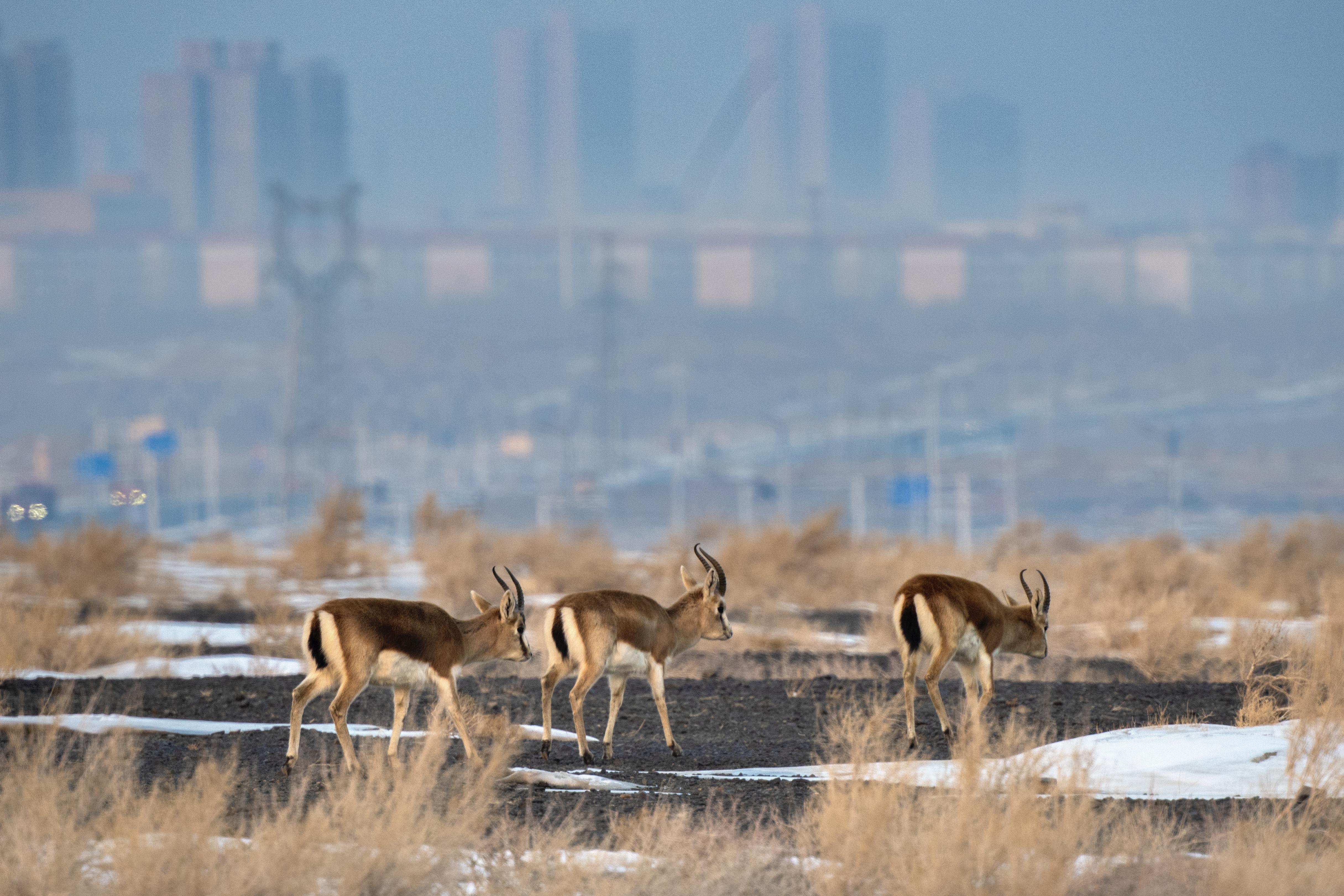 鹅喉羚在城郊自由活动