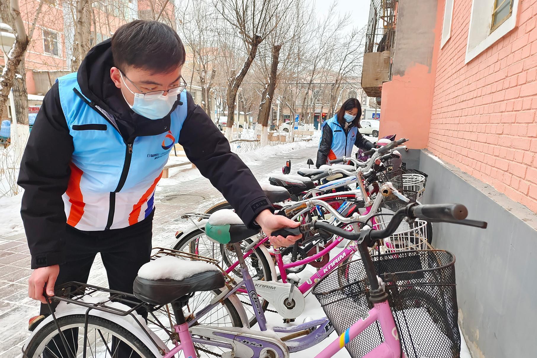 2月13日,田园社区志愿者将自行车按位摆放整齐。当天,田园社区文明实践站组织社区工作人员开展爱国卫生运动。大家拿着铁锹、扫帚等工具,清理积雪和杂物,让社区环境井井有条。