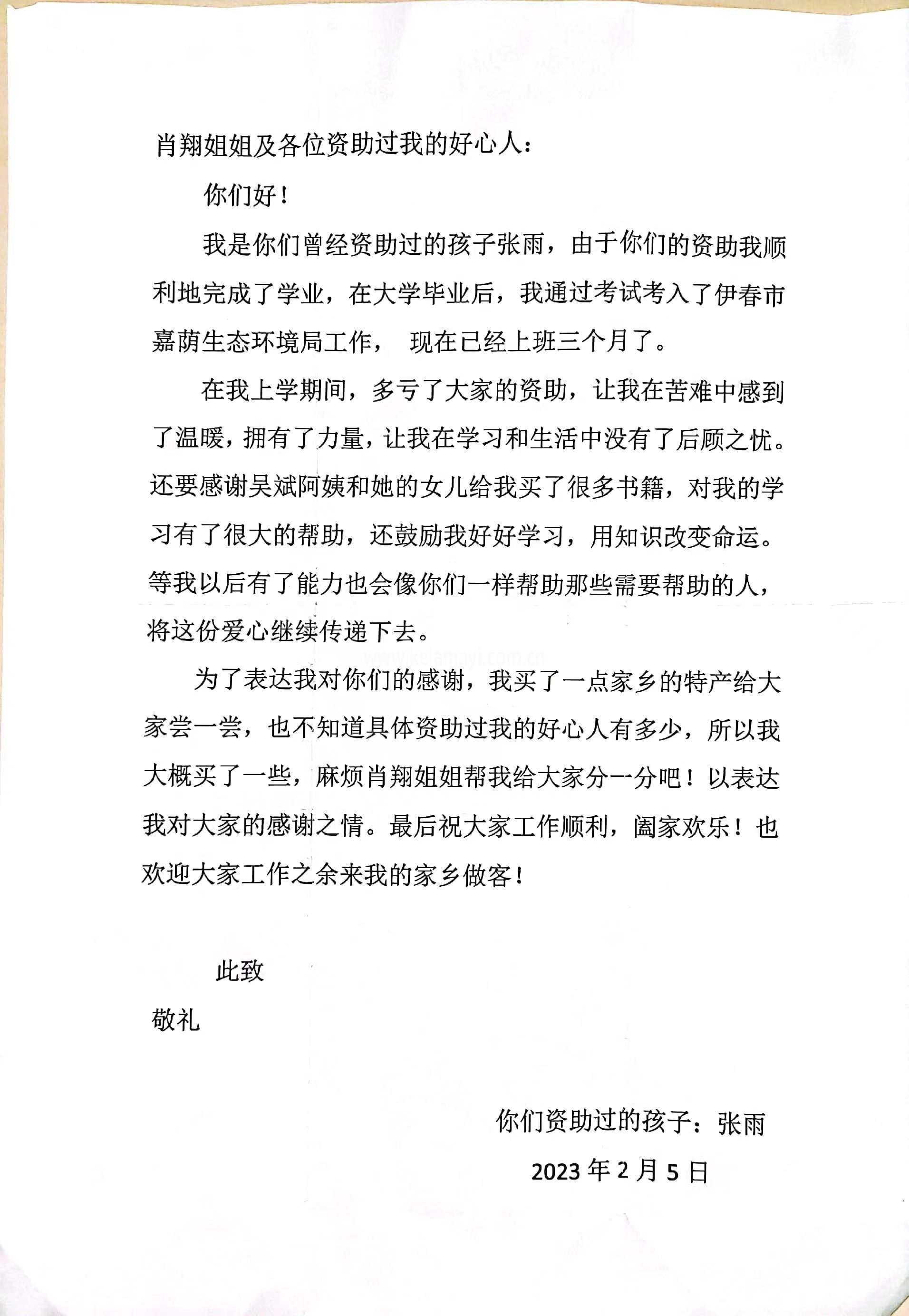 张雨带给员工们的惊喜则是一份份出色的成绩单。她很有礼貌,是个优秀的小姑娘。从小学到初中,员工们见证了她的成长,她从一个拘谨的、不太自信的孩子,成长为一名能与员工们畅谈理想、畅想未来的少女。虽远隔千里,只要看到她的文字,似乎都能看见她眼里的光。员工们先后为她邮寄了文具、书籍,期待她能有美好的未来。在义务教育阶段结束后,通过基金会的资助自动终止,当初负责与女孩们联系的员工吴滨继续给张雨邮寄书籍,并在必要的时候给予了资助。张雨考上了不错的高中,家庭环境有所改善。考虑到她繁重的学业,员工们便逐渐与她减少了联系,悄悄地退出了她的人生轨迹。