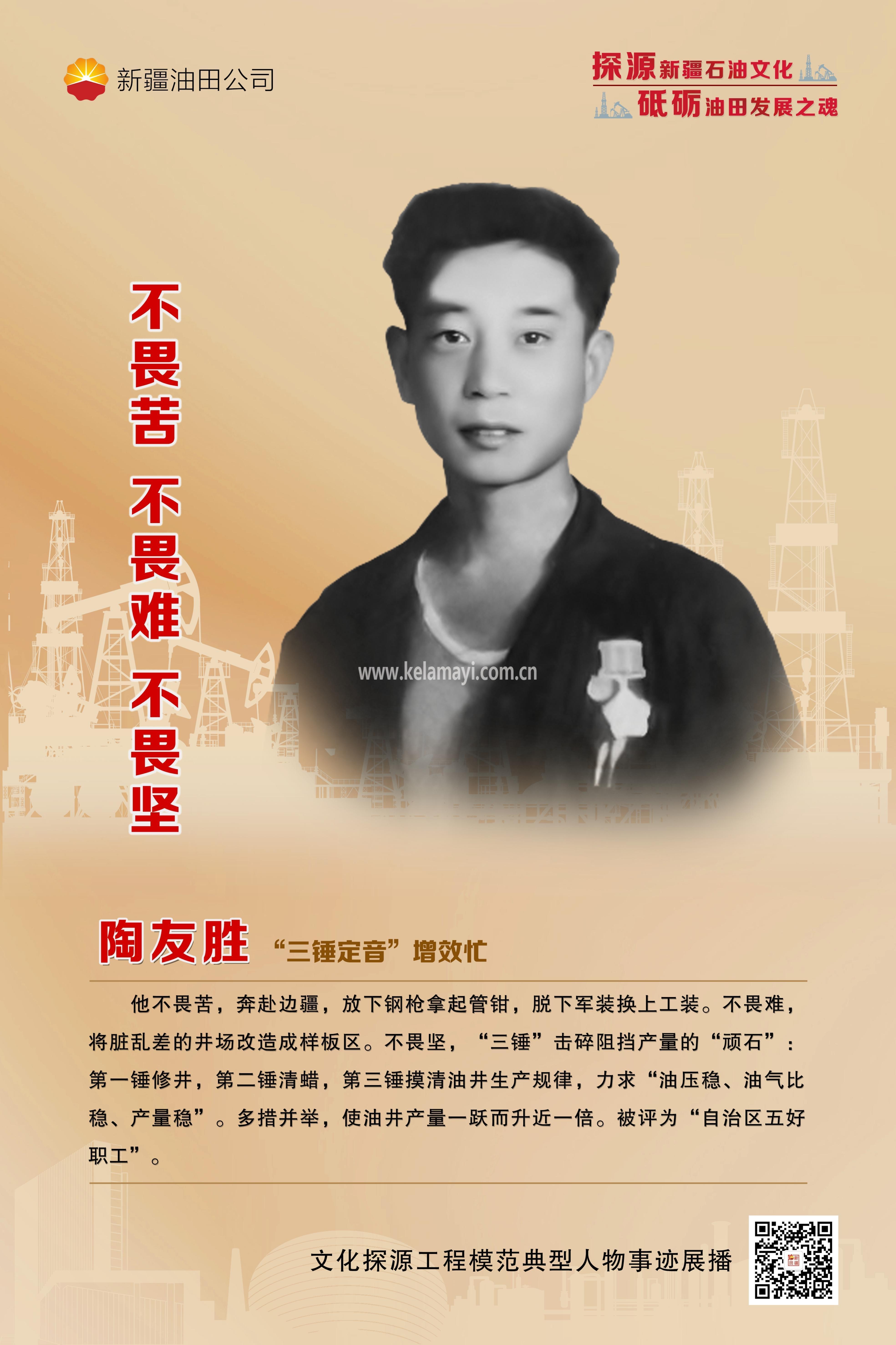 他,虽然文化水平不高,也缺乏从事石油事业的经验,但他不畏艰难,刻苦钻研,一点一点打好基础,敢于挑重担,敢于突破自我,解决了一个又一个的技术难题,创造了一个又一个辉煌。陶友胜,用钢铁般的军人意志,在石油事业上干出了不平凡的业绩。