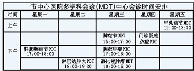 多学科联合会诊(MDT),是由多学科资深专家以共同讨论的方式,为患者制定个性化诊疗方案的过程,是一种“一站式”多学科诊疗模式。而市中心医院成立的“多学科会诊(MDT)中心”则整合了7支多学科会诊团队,不同团队的专家每周在固定时间、固定地点坐诊。