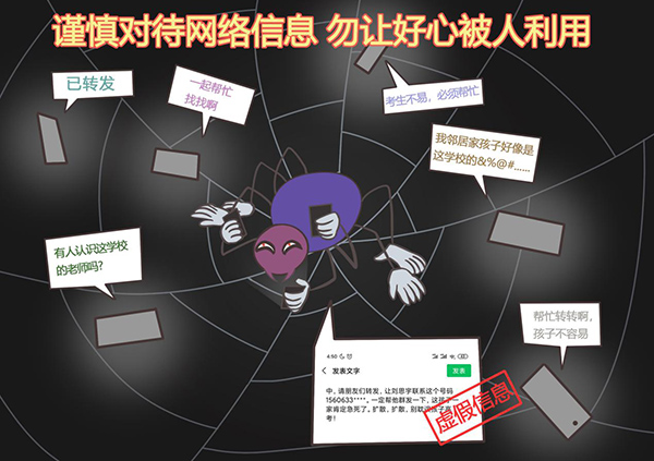 【案例1】2019年高考开考前夕,微信群、朋友圈等网络平台流传着一则虚假信息,声称“捡到一张高考准考证,刘思宇,考点在实验高中,请朋友们转发,让刘思宇联系这个号码1560633****。一定帮他群发一下,这孩子一家肯定急死了。扩散,扩散,别耽误孩子高考!”从2016年“白娅倩”、2017的“杨雷雷”“孙超”“党喜龙”、2018年“刘明炜”“刘明婷”等同学到2019年的“刘思宇”,年年丢失准考证,内容如出一辙,套路依旧。