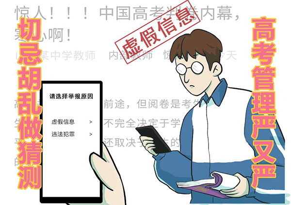 【案例】2019年高考前,一篇题为《惊人!!!中国高考判卷内幕,寒心啊!》的文章在网上热传。该文作者自称是“山西某中学教师”,参与过高考阅卷。在阅卷过程中发现,有一些阅卷老师为了赶进度,不管对错随意批改,而且复核者也未发现问题,甚至出现了“20分题被给0分”的极端情况。文章最后得出结论:“高考关系着考生的前途,但阅卷是考生的关口。考生能否顺利过关,不完全决定于学习成绩和答题水平,在很大程度上还取决于考生的运气,阅卷老师的心情。”此文涉及高考内容,吸引眼球,在网上流传至少已经超过10年,内容严重失实。由于内容过于“惊世骇俗”,每年高考之后总会被好事之徒拿出来传播。2019年,教育部官网在盘点高考谣言时已对该文进行过专门辟谣。